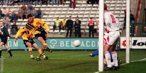 Adidas FC Arsenal London Trikot mit der 10 Paul Merson in Herrengröße L mit Brustsponor JVC aus der Saison 1993/94 es ist das gelbe auswärts Trikot. Unter anderem getragen von Tony Adams wie auf dem Bild zu sehen, beim Spiel gegen Standard Lüttich (STANDARD LIEGE) am 3 November 1993 schlug arsenal in diesem Trikot Standard Lüttich mit 0:7 in Lüttich