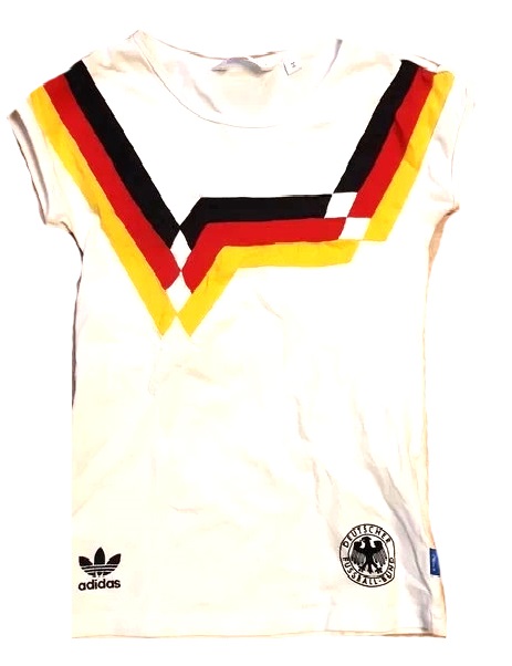 Adidas Deutschland T-shirt , im Design der WM 1990 in der Farbe weiß sowie in den Damengrößen 34 = S, 36 = S, 38 = S oder 40 = M und 42 = M, Es ist ein Original T-shirt aus der Adidas "Originals Serie", aus 100 % Baumwolle. Das T-shirt ist auf Hüfte geschnitten, wie es bei Damen üblich ist.