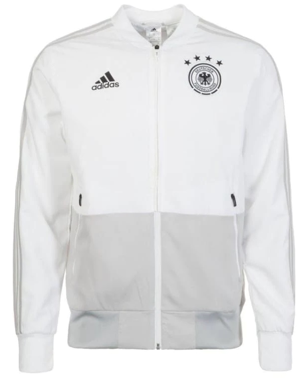 Adidas Germany Deutschland DFB Trainingsjacke Jacke 2018 in weiß grau von der WM 2018, im DFB Design. Die Jacke wurde vor den Spielen getragen 2018, daher auch Pre-Match-Jacke für Vor dem Spiel Jacke. Verfügbar 1 x in Herrengröße XL oder 2XL / XXL