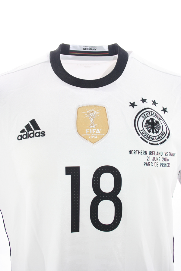 Adidas Deutschland Trikot mit dem Originalflock von der Nummer 18 Toni Kroos, so getragen bei der Euro 2016 in Frankreich in der Herrengröße L ist noch ein einziges verfügbar. Hier in der begehrten Heim-Trikot-Variante. Das Trikot mit der Nummer 18 Toni Kroos mit dem Match-Detail Patch aus dem Spiel gegen Italien bei der Euro, welches Deutschland gewann im Elfmeterschießen. DerPatch ist absolut gerade aufgebracht.