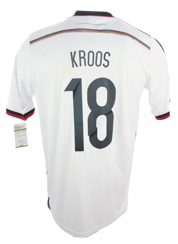 Adidas Deutschland DFB Heimtrikot 2014 mit dem original Flock von der Nummer 18 Toni Kroos, verfügbar jeweils 1x in der Herrengröße M oder XL. Alle Patches und Rückennummer sind gerade auf dem Trikot angebracht!