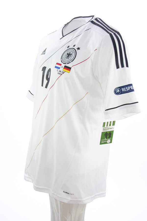 Original Adidas Deutschland Trikot, offizielles DFB Shirt von der EM 2012, verfügbar jeweils 1 x in den Herrengrößen S / M oder L. Belfockt mit der original Adidas Rückennummer von der Nummer 19 Mario Götze. Die Brustnummer ist absolut gerade angerbacht, durch den Fotowinkel kann das täuschen.