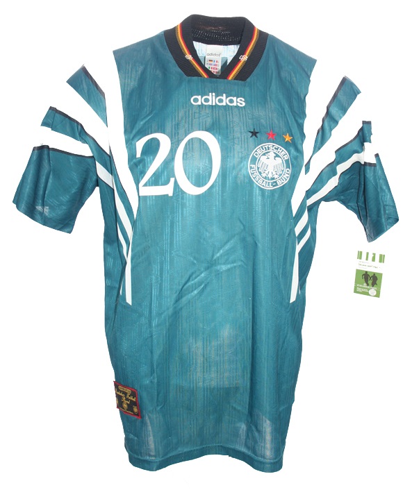 Adidas Deutschland Trikot von der Euro 96, 1996 mit der original Beflockung 20 Oliver Bierhoff Match Issued vom Hersteller Adidas mit den sehr begehrten Euro 1996 Schulter-Patches, Fair Play Patch und Euro 96 Patch, die Größe ist Herren XL, dieses sehr seltene und Exklusive Trikot gibt es nur einmal bei uns!. Es handelt sich um das begehrte Auswärtstrikot in der Farbe Grün.