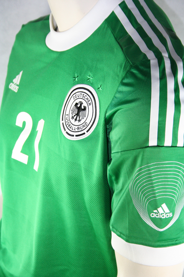 Original Adidas Deutschland Trikot, im begehrten Away design in Grün, offizielles DFB Shirt von der EM 2012, Größe 9 Herren entspricht größe L bei Techfit Trikots. Belfockt mit dem original Adidas Flock von der Nummer 21 Marco Reus.