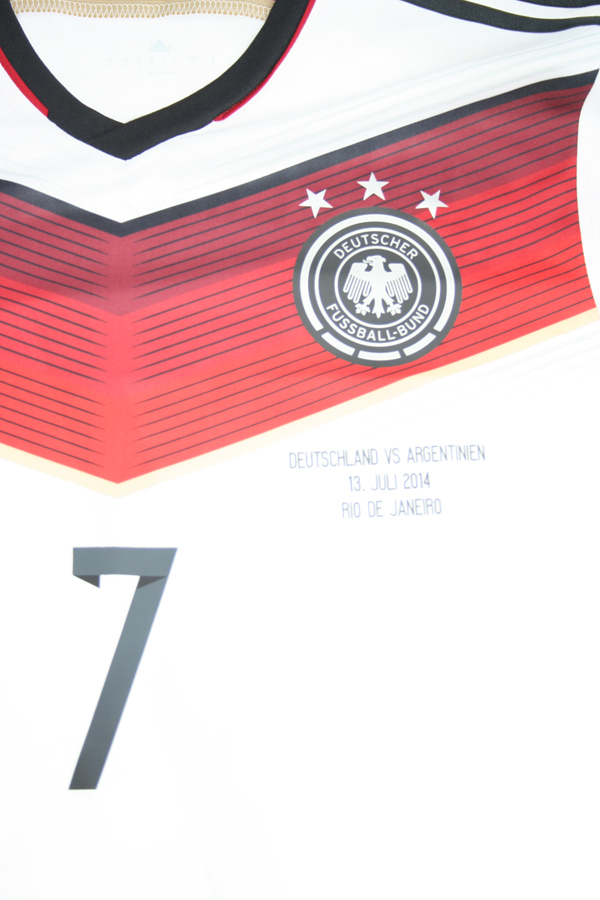 Das Trikot habe ich erhalten beim DFB Pressetermin, die hatten 1 Satz langärmelige Trikots mit und bei diesen Beiden hier ist was schief gelaufen, also hier bei dem und dem anderen von Mario Götze, diese Beiden haben leichte Verfärbungen, wenn man genau hinguckt sieht man es, auf den Bildern sieht man es gar nicht. daher wurden die beiden Trikots auch nicht mitgenommen, ich konnte sie abkaufen und fand sie auch sehr besonders. Sind sie auch Adizero und beinahe bei einer WM dabei, sowas gibt es ga rnicht käuflich zu erwerben. Das ist der Hammer überhaupt. Preislich ist es auch sehr gut, gerade für ein Adizero Trikot in der begehrten und nicht käuflich zu erwerbenden Langarmtrikotversion.