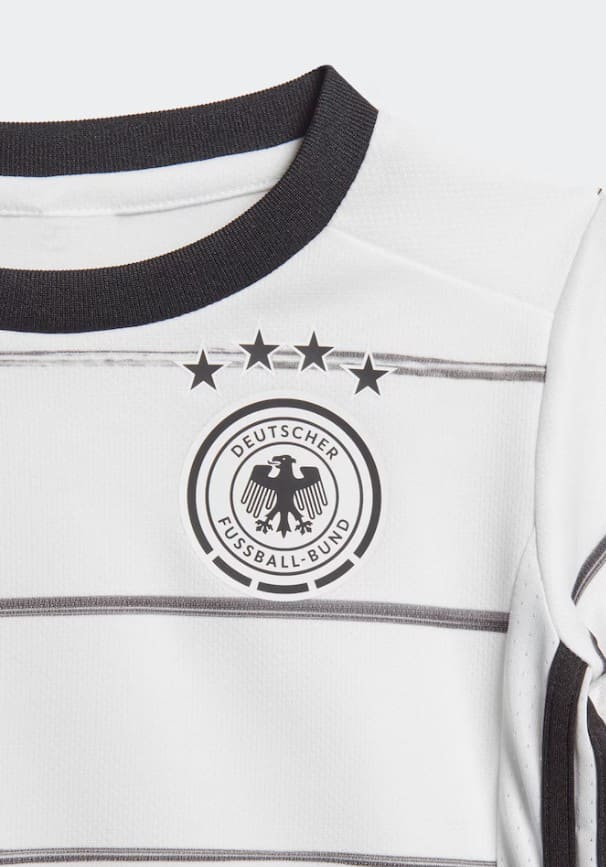 Adidas Deutschland Trikot von der Fußball-Europameisterschaft 2020 / 2021 in der Heimtrikot in der Farbe weiß, offizielles DFB Minikit Trikot mit 4 Sternen und verfügbar ist es jeweils noch jeweils 1 x in jeder größe verügbar in der Babygröße 68 cm für 3 bis 6 Monate oder in der Kindergröße / Babygröße 74 (74 cm, für Babies von 6 bis 9 Monaten) spwie in 86 (86 cm, für Babies/Kleinkinder im Alter von 12 bis 18 Monaten ist es jeweils 1 x verfügbar in jeder Babygröße. Dazu kommt das Set, mit der passenden kurzen Hose/Shorts in schwarz von adidas.