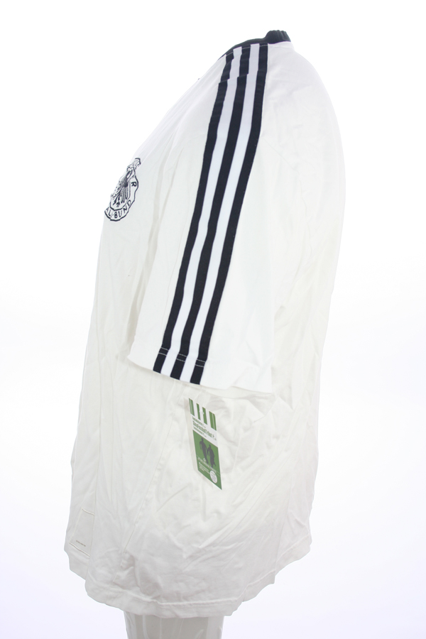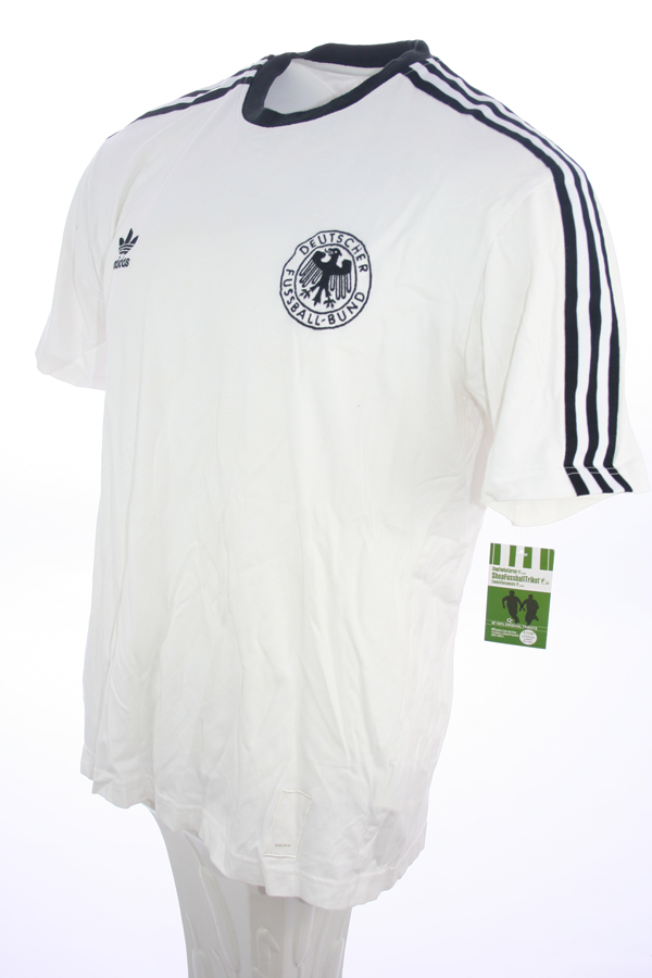 Adidas Deutschland Trikot DFB von der WM 1974 in Deutschland. Der DFB wurde im eigenen Land Fußball Weltmeister, hier ein originales Retro Trikot im Original Design in der Farbe weiß von 1974 in der Herrengröße XL