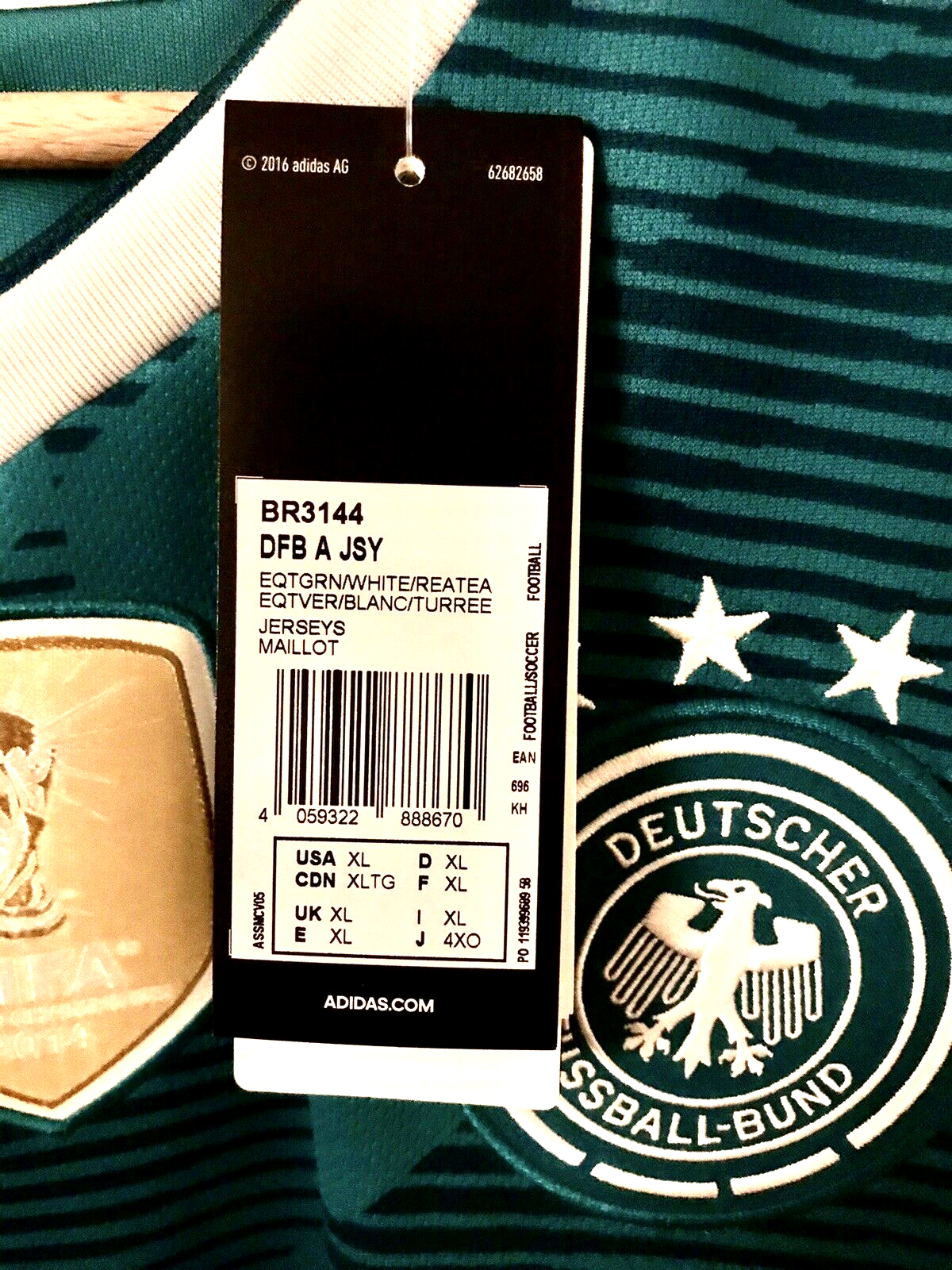 Adidas Deutschland Trikot von der Fußball Weltmeisterschaft WM 2018 in der Auswärtstrikotversion in der Farbe Grün, offizielles DFB Trikot mit 4 Sternen und verfügbar ist es jeweils noch 1 x in den Herrengrößen S, M, L, XL oder XXL. Das Trikot ist Neu mit Adidas Etiketten.