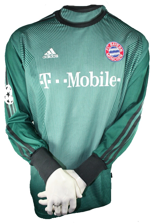 Adidas FC Bayern München Torwarttrikot aus der Champions League Saison 2003/04 1 Oliver Kahn.Das Trikot stammt aus dem Spiel FC Bayern MÜnchen gegen Real Madrid vom 24.02.2004 der Entstand war ein 1:1 der besagte Hammer von Roberto Carlos, wurde danach in der Presse rauf und runter diskutiert. Es handelt sich um ein Match-IssuedTrikot also ein Trikot das für Oliver Kahn persönlich vorbereitet wurde. MIt Brustsponsor T-Mobile. Nur noch 1 x in Herrengröße S 1 x verfügbar.