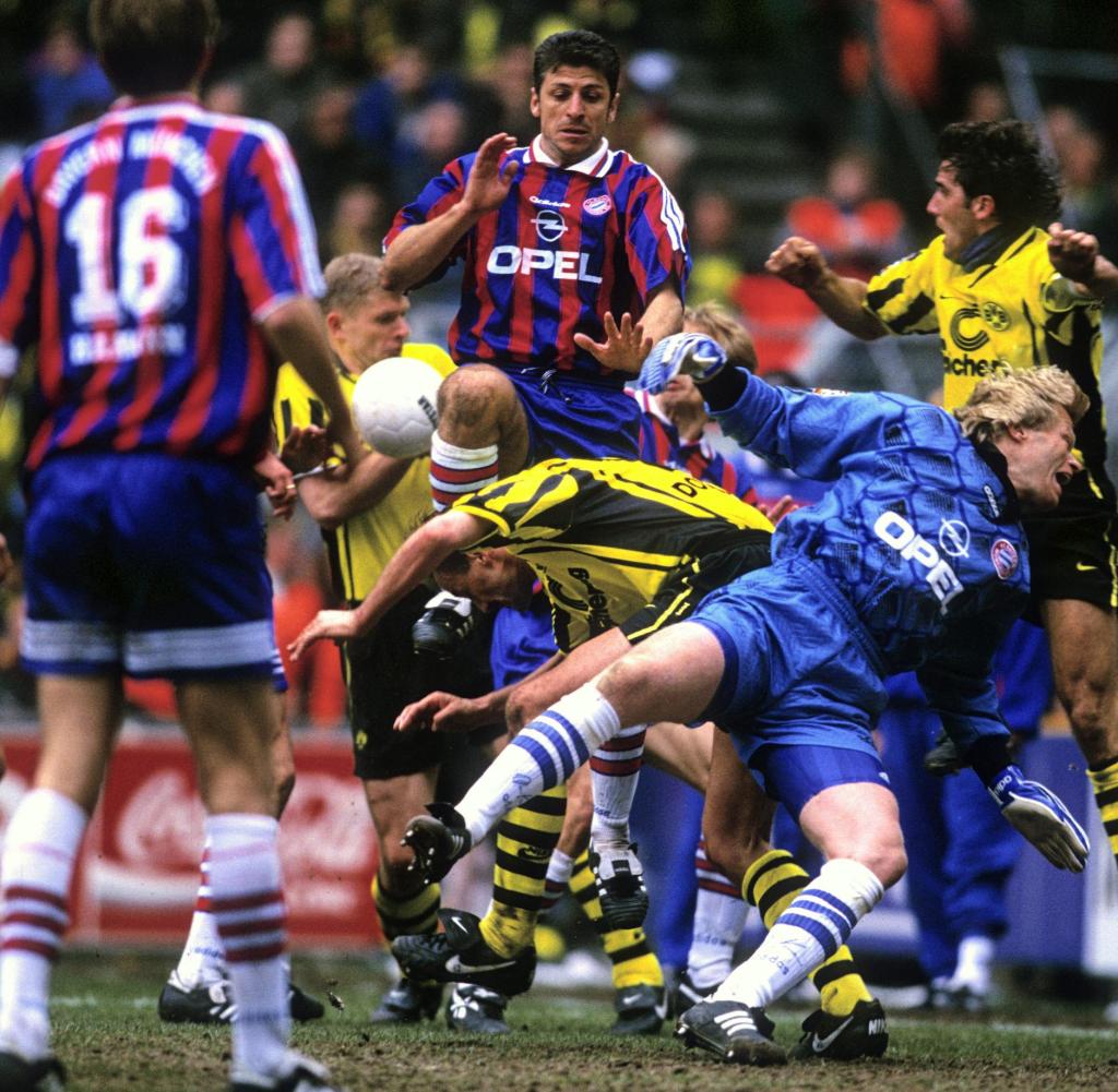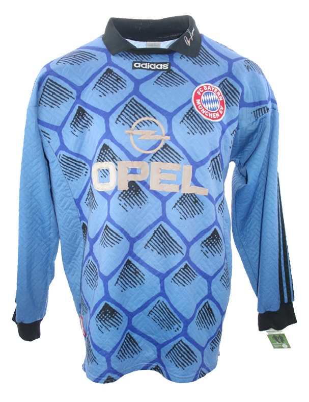 Adidas FC Bayern München Trikot mit der original Beflockung aus dieser Saison von der Nummer 1 Oliver Kahn aus der Spielzeit 1997/98 mit dem damaligen Opel Sponsor, in Herrengröße M