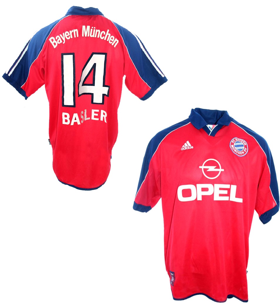 Adidas FC Bayern München Trikot von der Nummer 14 Mario Basler aus der Saison 2000/01 mit dem Brustsponsor Opel in der Herrengröße XL. Am Saisonende stand der Gewinn der Cl zu Buche für den FC Bayern München, dieses Trikot wurde in der Gruppenphase eingesetzt damals.