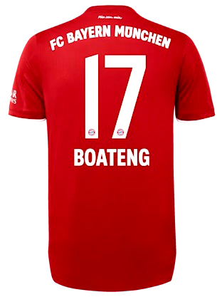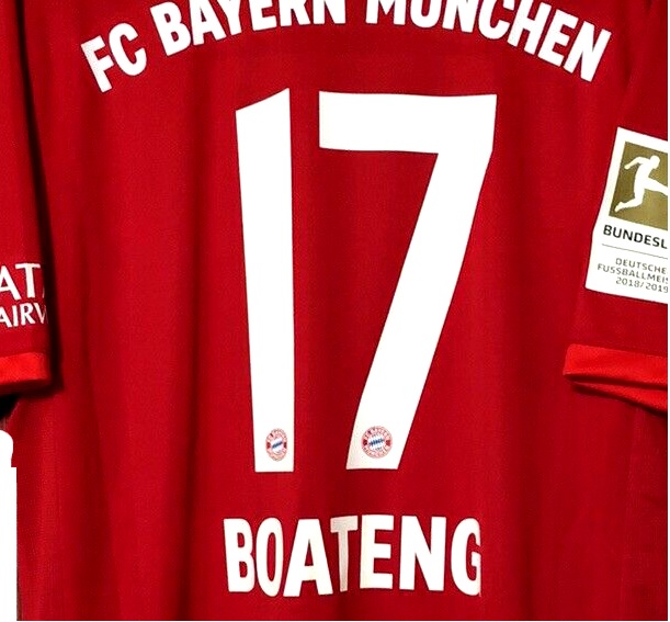 Adidas FC Bayern München Trikot 17 Jerome Boateng aus der Saison 2019/20 in der Heimtrikotversion mit dem Spnosor Telekom T-com in der Farbe rot, verfügbar nur noch 1 x in der Herrengröße M mit dem passenden Bundesliga Patch auf der Schulter