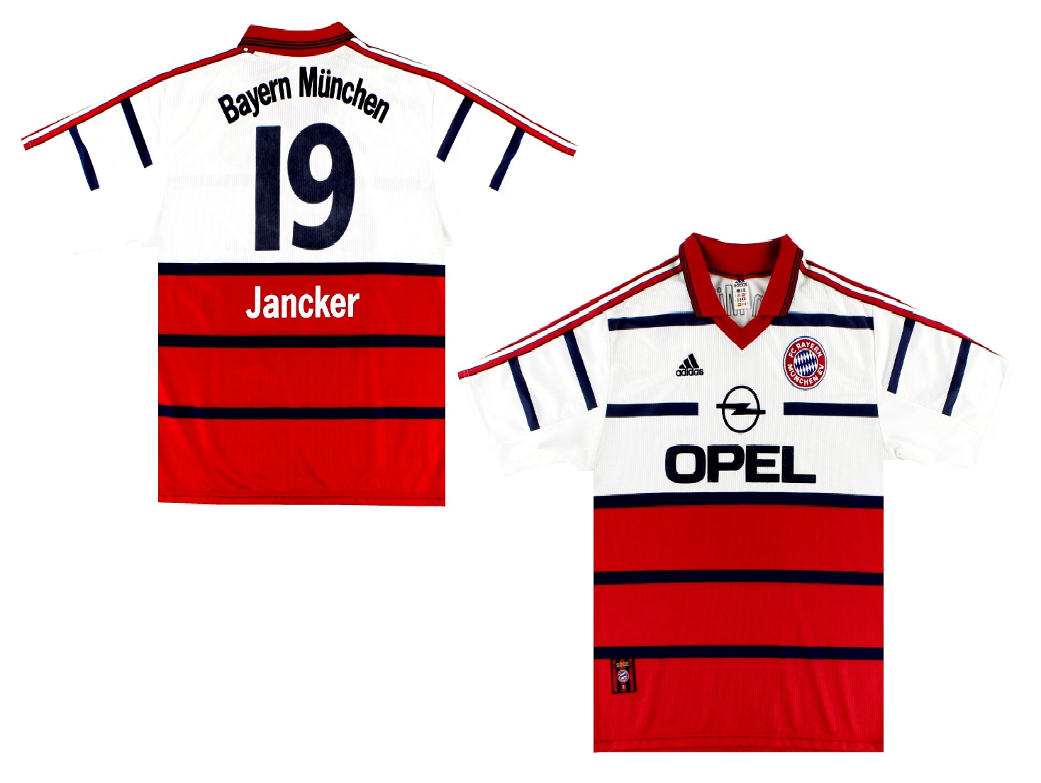 Adidas FC Bayern München Trikot mit der original Beflockung 19 Carsten Jancker aus der Saison 1998/99 mit Opel Sponsor auf der Brust, wo der FC Bayern München deutscher Fußball Bundesliga Meister wurde 1998/1999, hier noch einmal verfügar in den Herrengrößen XL.