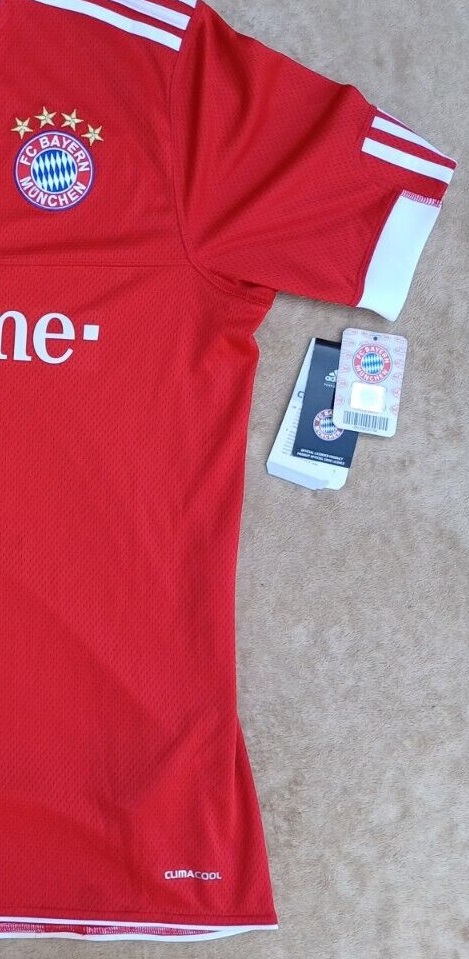 Adidas FC Bayern München Trikot aus der Saison 2009-2010 mit dem Brustsponsor T-Home in der Herrengröße L ist noch 1 Trikot verfügbar, in der Heimtrikotversion in der Farbe rot. Es ist neu mit adidas Etiketten.