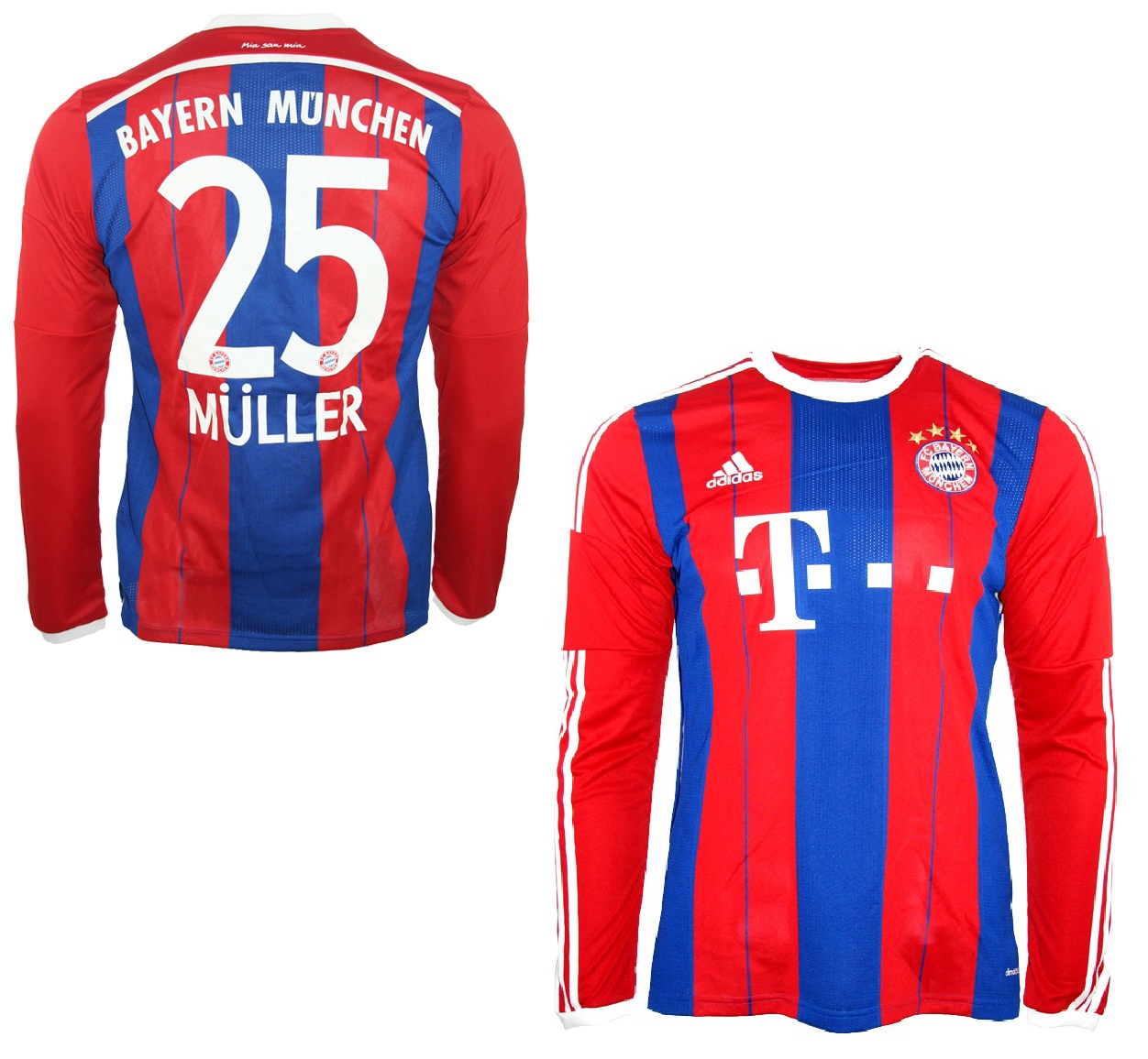 Adidas FC Bayern München Trikot mit der Nummer 25 Thomas Müller aus der Saison 2014/15. Das Trikot ist in Herrengröße M oder XL verfügbar. Das Trikot ist in der Farbe Rot Blau gestreift in Anlehnung an die frühreren Trikots des FC Bayern München. Es ist die Langarmtrikotversion. Es ist Neu mit Etiketten