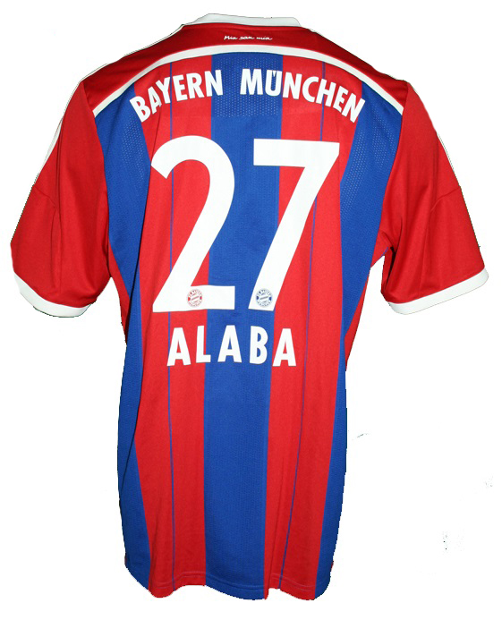 Adidas FC Bayern München Trikot mit der Nummer 27 David Alaba aus der Saison 2014/15. Das Trikot ist in Herrengröße XXL. Rot Blau gestreift in Anlehnung an die frühreren Trikots des FC Bayern München