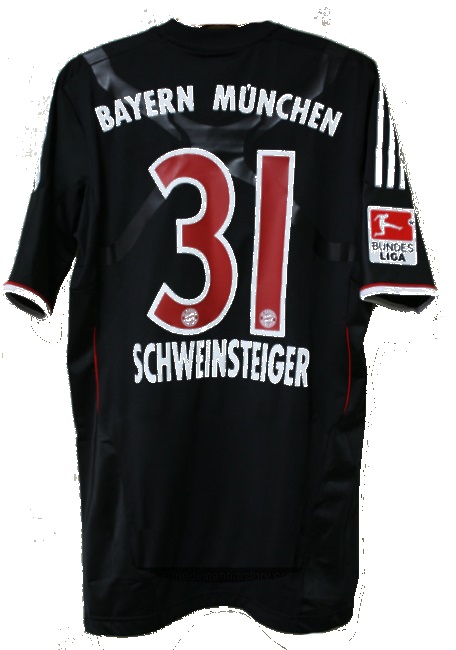 Adidas FC Bayern München Trikot mit der originalen 31 Bastian Schweinsteiger aus der Fußball Bundesliga Saison 2011/12 und in der Farbe schwarz, sowie mit dem Sponsor T-Com ist es 1 x verfügbar in Herrengröße M - Ohne Patches bisher auf den Schultern, Pokaltrikot für den DFB Pokal und die Champions League vereinszelt, auch in der Bundesliga, wenn keine andere Kombination aus Heim und Auswärtstrikot mehr möglich war.