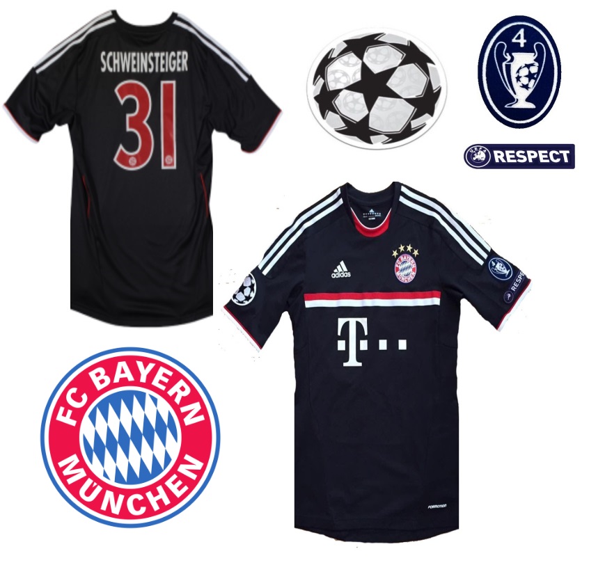 Adidas FC Bayern München Trikot mit der originalen 31 Bastian Schweinsteiger aus der Fußball Bundesliga Saison 2011/12 und in der Farbe schwarz, sowie mit dem Sponsor T-Com ist es 1 x verfügbar in Herrengröße L. das Trikot hat den Starball Patch, den Trophy patch und den Respect patch auf der Schulter