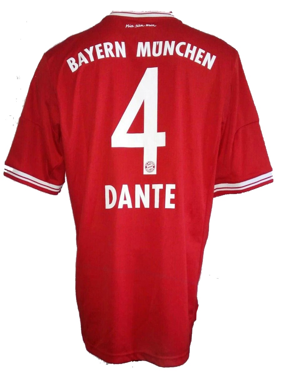 Adidas FC Bayern München Trikot mit der orignal Beflockung von der Nummer 4 Dante, aus der Saison 2013/14, hier in der Heim-Trikot-Version von Adidas, vom FC Bayern München in der Herrengröße M oder L ist jeweils 1 einziges verfügbar, auf Wunsch mit dem UEFA Champions League patches und dem Final Winner Patch auf der Brust. Wie im spielgetragen. Wir haben nur original Trikots! Dieses Trikot von der südamerikanischen-brasilianischen Stimmungskanone Dante, ist einfach ein legendäres Fußballtrikots wie Matze Knopp auch schon herausgefunden mit seiner Parodie von Dante, ich finde ihn unglaublich sympathisch und daher ist es auch hier im Shop! Die 2013er Trikots hier, sind auch ungewöhnlich stabil von der Qualität, was beim FC Bayern München nicht immer so ist, da wünscht man sich ja gerne mal, dass ein Trikot vielleicht nicht solange hält, damit die Kunden neue erwerben, hier gibt es wenig beschädigte Shirts auf dem Markt ,dennoch bei Trkots mit Namen und Nummer ist nur noch Handwäsche möglich, auch bei euren die hier schon zu Hause habt!! und niemals in den Trockner legen und keinen Weichspüler!