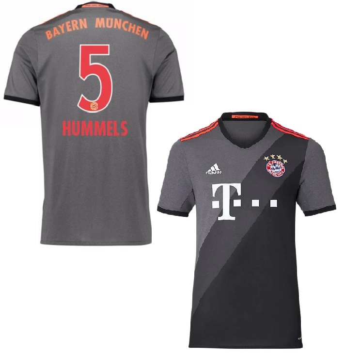 Adidas FC Bayern München Trikot mit der Nummer 5 Mats Hummels aus der Saison 2016/17. Das Trikot ist in Herrengröße L. Das Trikot ist die Auswärtstrikotversion der Saison 16/17 in der Farbe Schwarz/Grau/Anthrazit