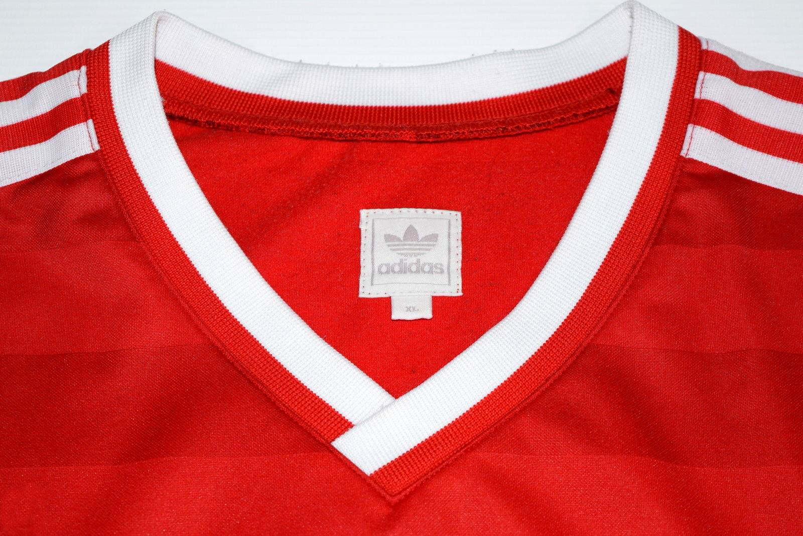 Adidas FC Bayern München Trikot aus der Saison 1986/87 mit dem Sponsor Commodore in der Herrengröße M (5/6), es ist die Heimtrikotversion in der Farbe rot aus der Adidas Originals Kollektion.