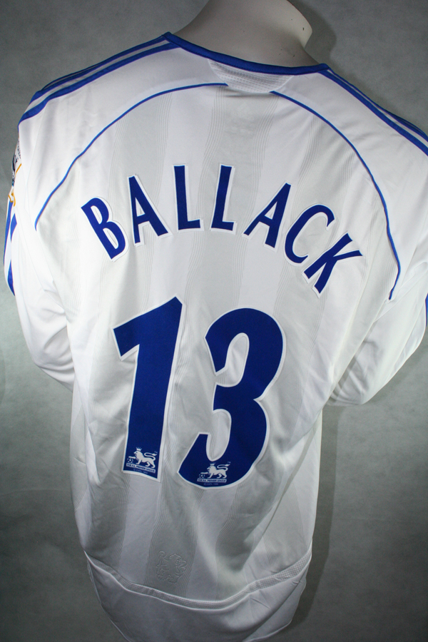 Adidas FC Chelsea Trikot von der Nummer 13 Michael Ballack mit dem Brustsponsor Samsung mobile aus der Saison 2007/08 in der Herrengröße XL. In der Formotion Version, nur für Spieler ausgegeben und dem Meister Patch 2005/06 auf den Ärmeln. Persönlich erhalten von Michael Ballack.