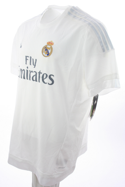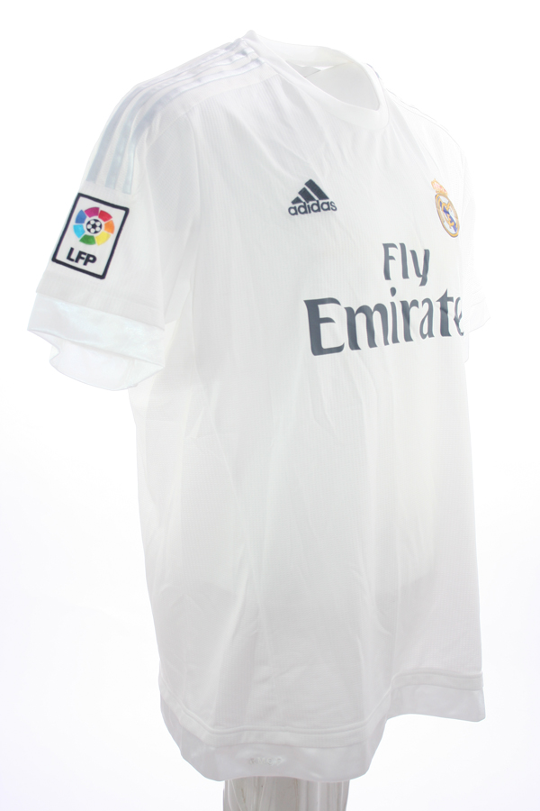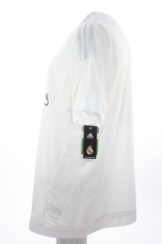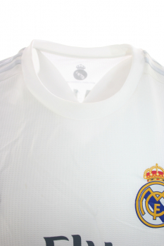 Adidas Real Madrid Trikot heimtrikot in weiß von der Nummer 11 Gareth Bale aus der Saison Bale 2015/16 mit dem Brustsponsor Fly Emirate verfügbar in der Herrengröße M/XL oder XXL (2XL). Mit den Patches auf den Schultern, wie in der LIga genauso getragen in Spanien. hier die letzten Trikots mit patches auf der Schulter und der original Beflockung auf dem Rücken mit 11 Bale. Das Adidas Real Madrid Trikot in weiß Fly Emirates ist Neu mit Etiketten von Adidas.