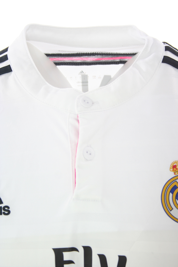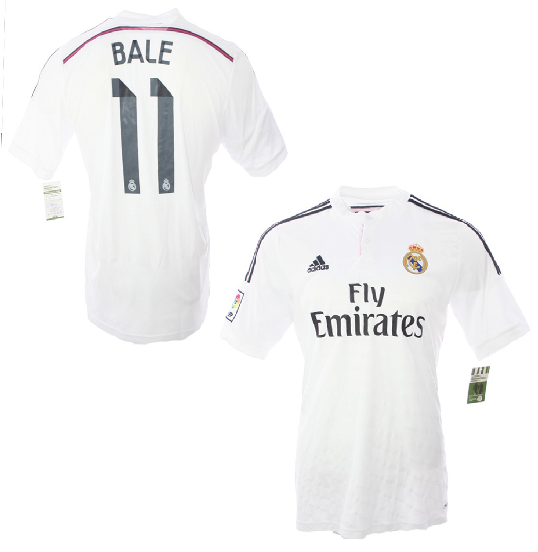 Adidas Real Madrid Trikot heimtrikot in weiß von der Nummer 11 Gareth Bale aus der Saison 2014/15 mit dem Brustsponsor Fly Emirate verfügbar in der Herrengröße M und L ist jeweils 1 einziges verfügbar. Mit den Patches auf den Schultern, wie in der LIga genauso getragen in Spanien. hier die letzten Trikots mit patches auf der Schulter und der original Beflockung auf dem Rücken mit 11 Bale.
