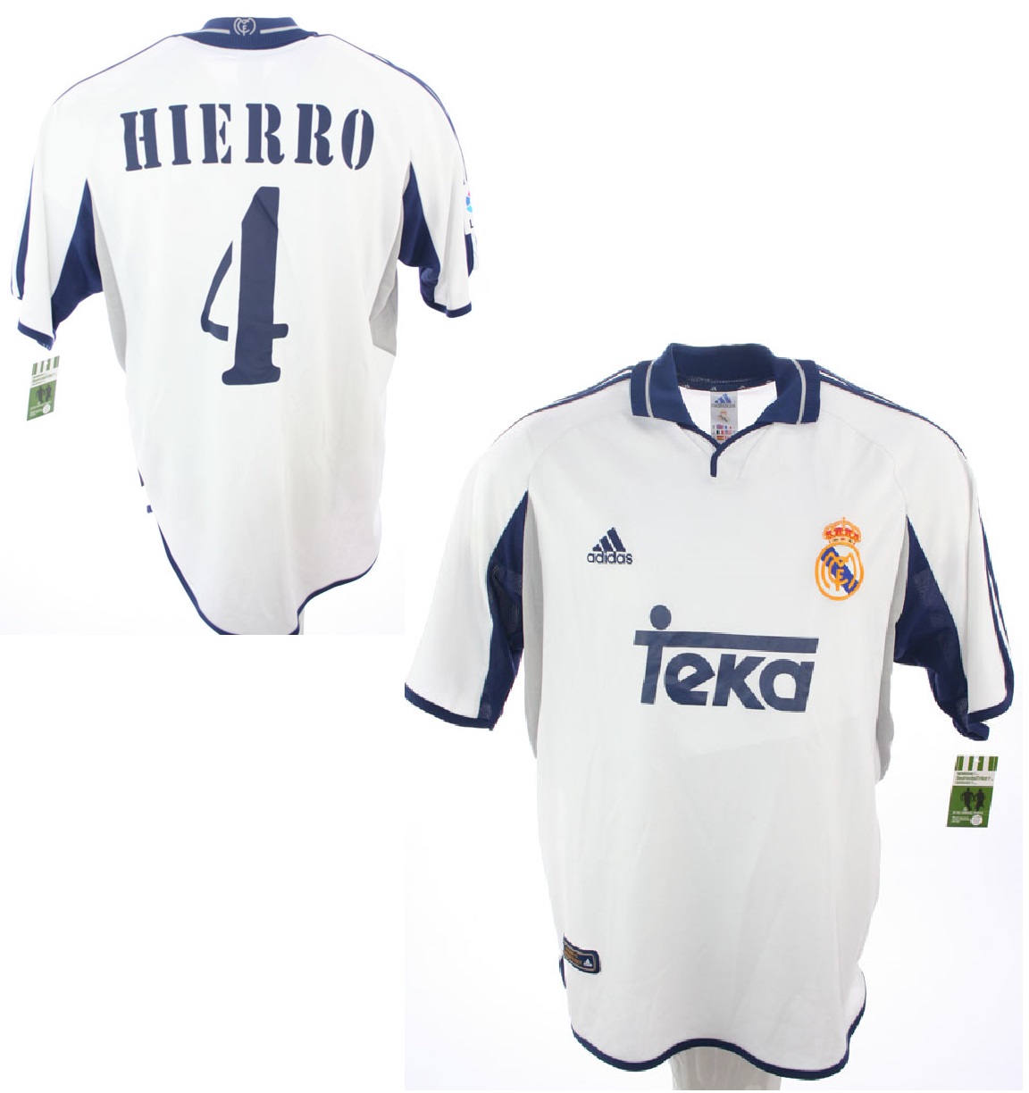 Adidas Real Madrid Trikot beflockt mit der Nummer 4 Fernando Hierro, so getragen in der Saison 2000/01, hier in der Heim Variante in der Farbe Weiß. Verfügbar in der Herrengröße XL. Brust Sponsor ist Teka.