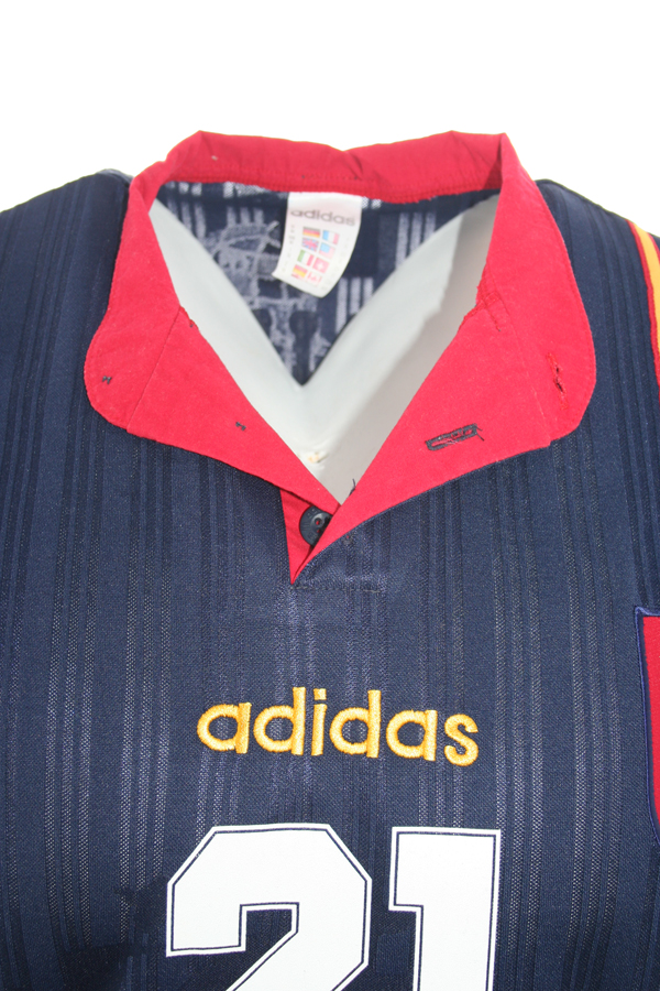 Adidas Spanien Trikot beflockt mit der Nummer 21 Luis Enrique welches genauso bei der Euro 1996 bei der EM 96 in England so getragen wurde im Auswärtstrikotdesign, in der Farbe Blau. Verfügbar ist es nur ein einziges mal in der Herrengröße M