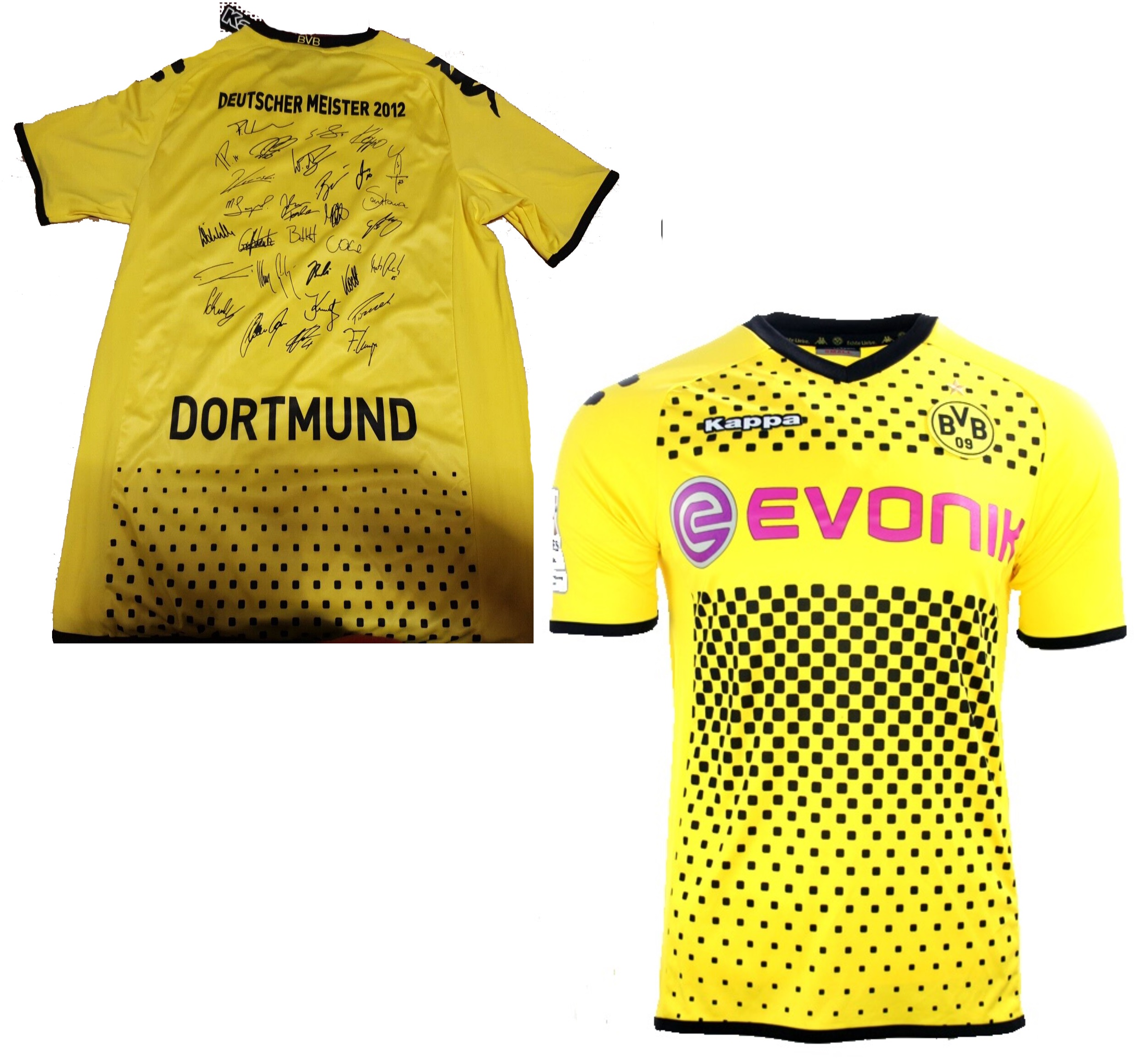 Kappa Borussia Dortmund Trikot v aus der Saison 2011/2012 mit dem Brustsponsor Evonik, verfügbar ist es in der Herrengröße L, das Trikot ist neu mit Kappa-Etiketten. Es gibt nur noch das eine einzige und wird auch vermutlich kein 2 davon jemals geben bei uns. Hier mit den Unterschriften des gesamten Teams auf dem Rücken, von der Meisterschaft 2012.