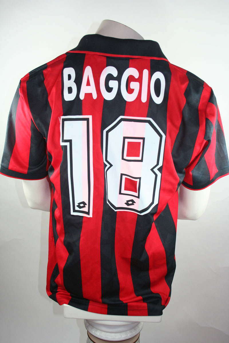 Lotto AC Mailand Trikot Heim 1994/1995 18 Baggio Schwarz/Rot in der Herrengröße XL. Mit der Orignal Beflockung von der Nummer 18 Roberto Baggio, dem Superstar des AC Mailand. Unvergessene Dribblings und Tore die er regelmässig erzielte für den AG Mailand.