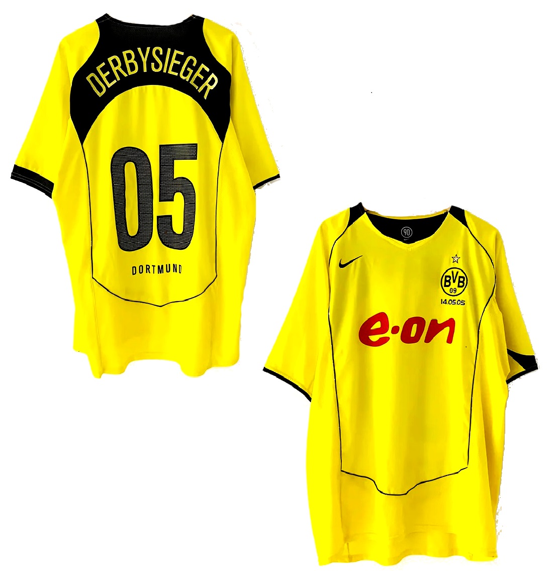 Borussia Dortmund BVB Nike Meister Trikot L 2004/05 E-on Derbysieger 05. Mit dem Datum des Spiels unter dem BVB Logo 14.05.2005, mit der original Beflockung 05 Derbysieger die nur 2004/05 so getragen wurden ist. Verfügbar nur 1 x in Herrengröße XL