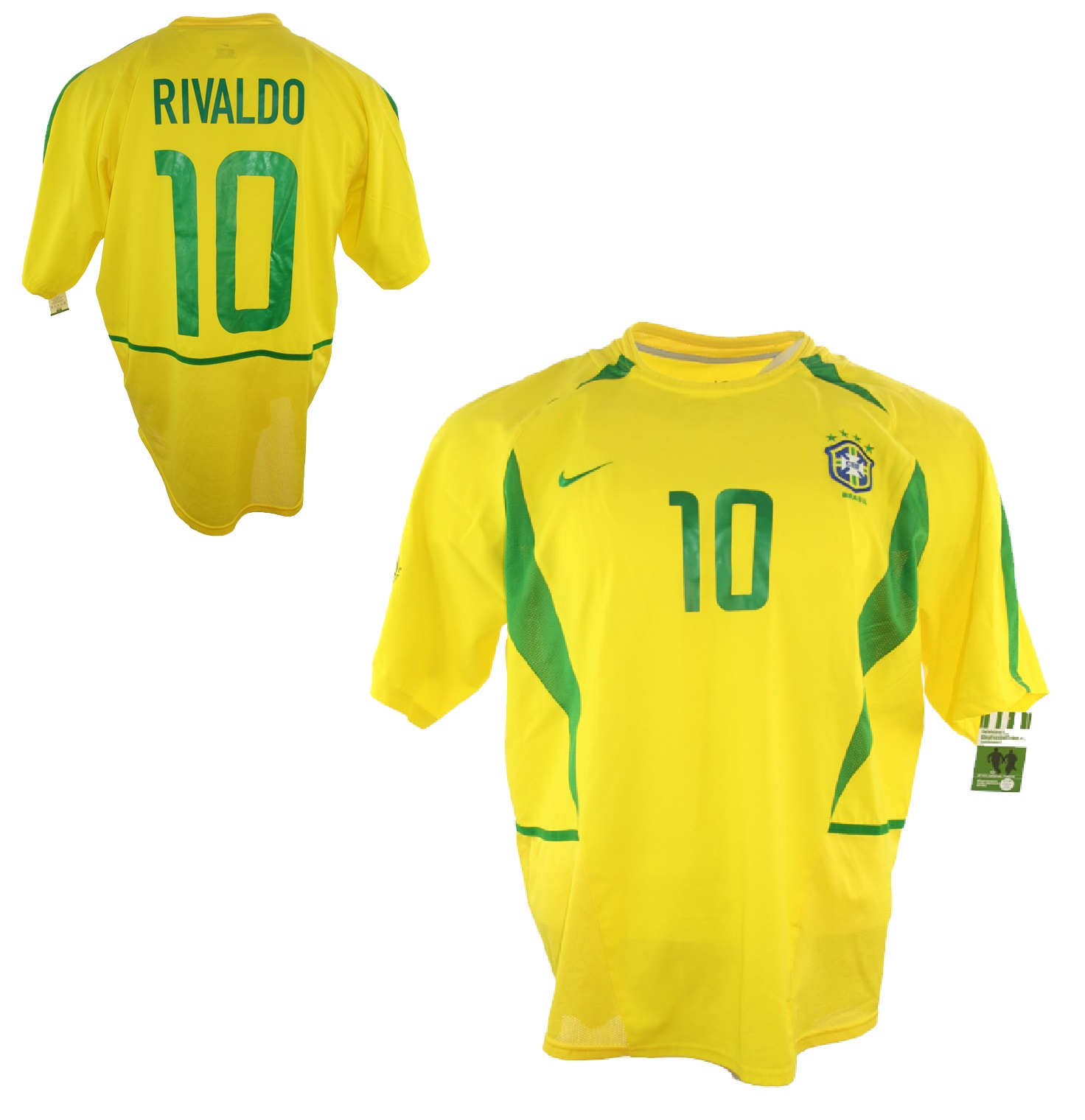 Nike Brasilien Trikot von der Fußball WM 2002 wo Brasilien Weltmeister wurde und 10 Rivaldo, einer der besten Mittelfeldregisseure die wir je hatten auf der Welt. Verfügbar in der Herrengrößen XL.