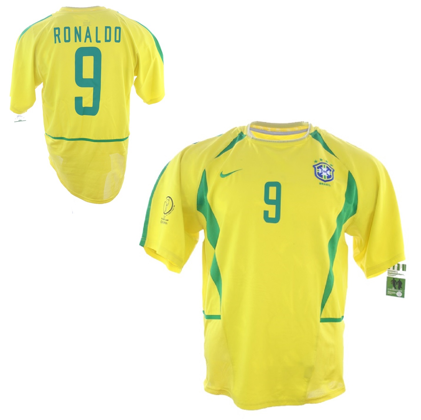 Nike Brasilien Trikot von der Fußball WM 2002 wo Brasilien Weltmeister wurde, hier noch einmal von den Stars der WM 6 Roberto Carlos, 9 Ronaldo, 10 Rivaldo oder 10 Ronaldinho oder 11 Ronaldinho verfügbar. In der Herrengröße L oder XL.