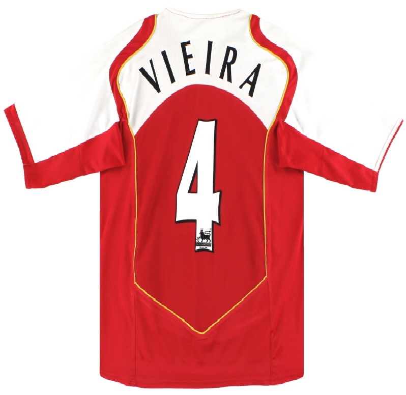 Nike FC Arsenal London Trikot mit der original Belfockung von der Nummer 4 Patrick Vieira aus der Saison 2004/05 in der Herrengröße XL, hier als B-Ware, da der Sponsor leider keine 2 mehr hat, bei o2 und hinten die 4 wie auf einem bild dargestellt, eine verfärbung hat, nichtsdestotrotz, ein top seltenes Trikot vom topspieler.
