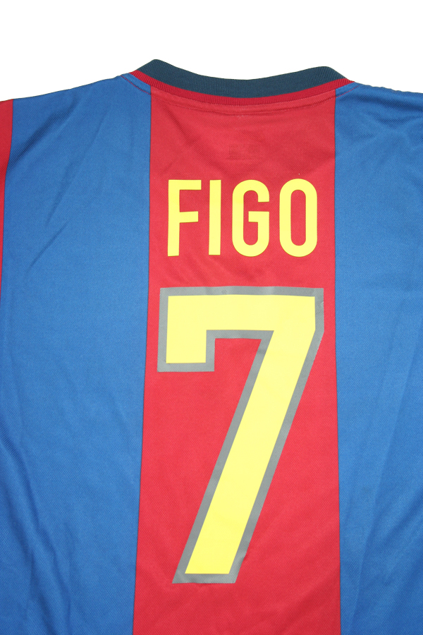 Zum Verkauf steht ein originales Nike Heimtrikot des FC Barcelona aus der Saison 1998/1999, ausgestattet mit dem originalen Namen und der Rückennummer 7 von Luis Figo.