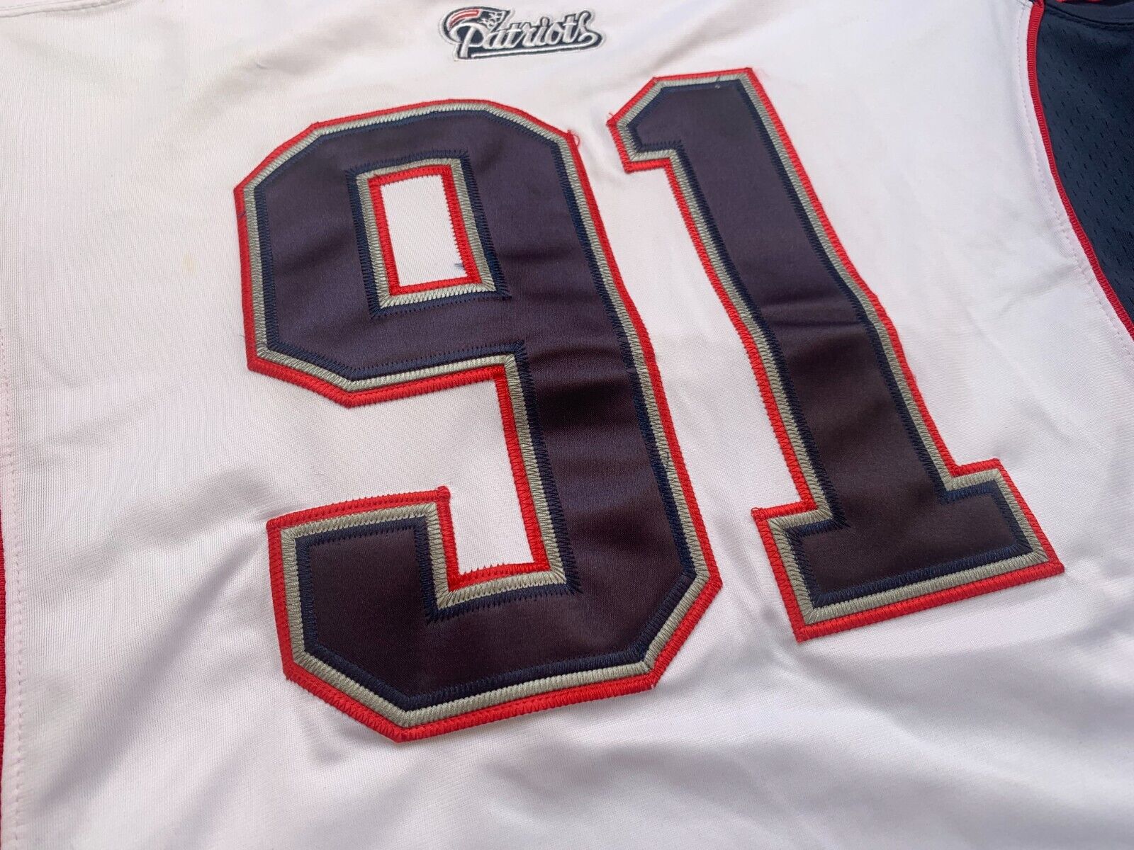 Original Reebok New England Patriots Trikot beflockt mit der Nummer 91 Jamie Collins offizielles NFL Trikot in der Farbe weiß in Authentic design in Herrengröße M in der Farbe weiß.