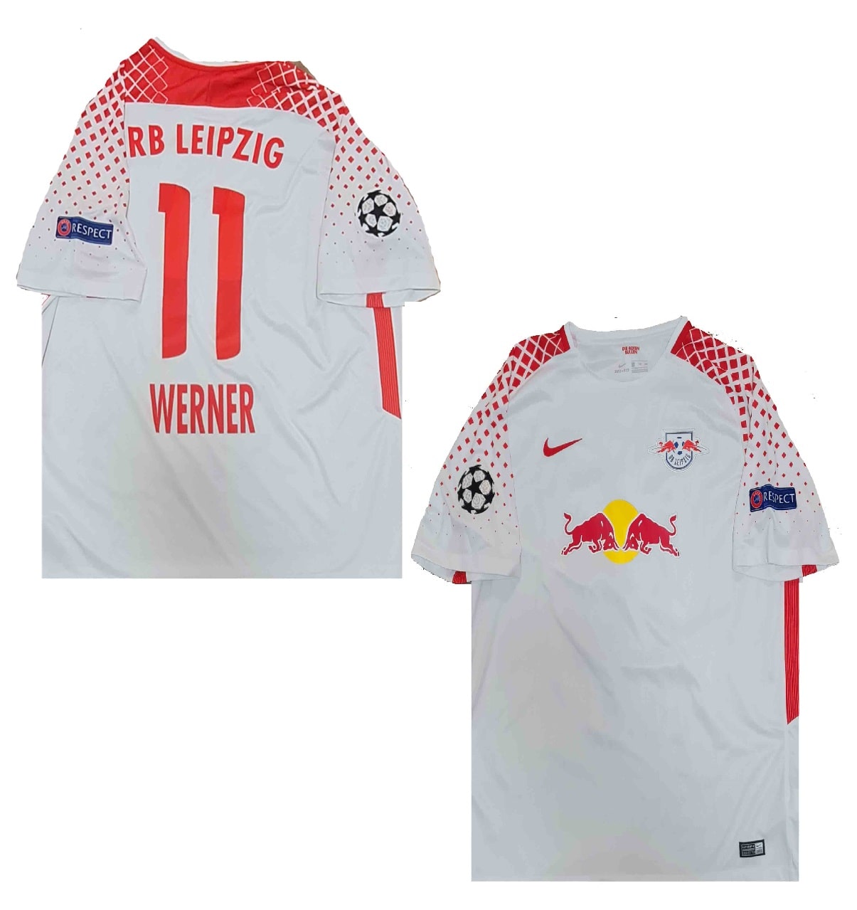 Nike RB Red Bull Leipzig Trikot mit der Rückennummer 11 Timo Werner aus der Saison 2017/18 in der heimversion in der Farbe weiß und verfügbar in der Herrengröße XXL/2XL, es hat auf den Schultern die UEFA Champinons League Patches aufgebracht