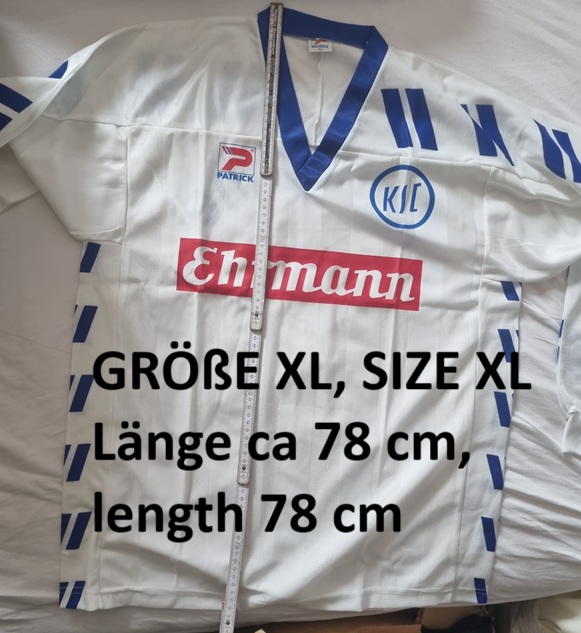 Patrick Karlsruher SC Trikot auf Wunsch mit der original Beflockung von z.B den damaligen Topstars mit der Nummer 9 Edgar Schmitt oder 10 Sergey Kiryakov oder aber auch von den Stammspielern 3 Slaven Bilic 5 Manfred Bender 8 Valerie Schmarov und 11 Rainer Schütterle sind möglich, von den anderen Spielern habe ich die Nummer auch nach intensiver Recherche nicht herausfinden können aus den Saisons 1992 bis 1994 vom KSC, das Trikot hat zudem den begehrten Sponsor Ehrmann und ist noch jeweils 1 x in den Herrengröße L, XL oder XXL verfügbar. Das Trikot wurde beim legendären 7:0 über den FC Valencia getragen, was bis heute eines der größten Spiele das Karlsruher SC gewesen ist. Neu mit Patrick Verpackung! unglaublich! Die Nummer Euro Eddie schoss in diesem Spiel im Wunder vom Wildpark 4 Tore!