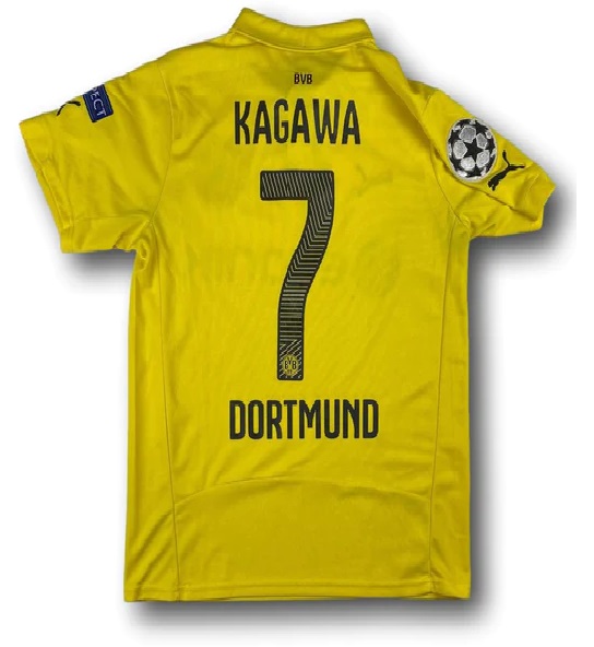 Puma Borussia Dortmund Trikot 7 Shinji Kagawa vom BVB aus der Saison 2014/15, es handelt sich hierbei um die UEFA Champions League Trikotversion in der Heimtrikotversion in der Farbe Geld, mit dem Evonik Brustsponsor in der gelben Heimtrikotvariante. Verfügbar ist es 1 x in der Herrengröße Herren S-M, die tatsächlich Kindergröße 176 cm entspricht, aber etwas größer ist, als Herrengröße S.