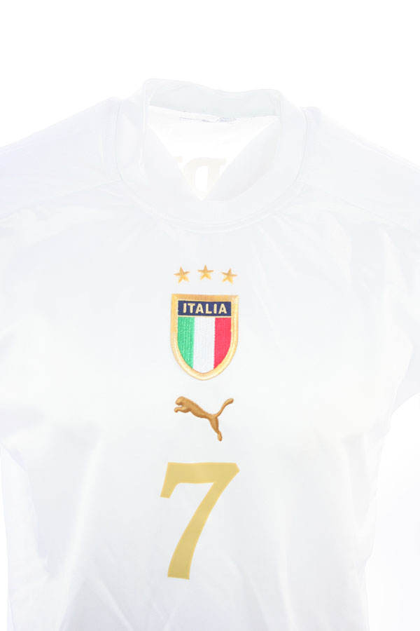 Puma Italien Trikot von der Nummer 7 Alessandro Del Piero von der Euro 2004 in der Herrengröße XL. Von der Euro 2004 in Portugal. Mit den Euro 2004 Patches auf der Schulter. Es sieht aus wie Matchworn Trikot,wie das Trikot das von Alessandro del Piero tatsächlich im Spiel getagen worden ist. Das Trikot ist in der Auswärtsversion der für die Euro 2004 in der Farbe weiß