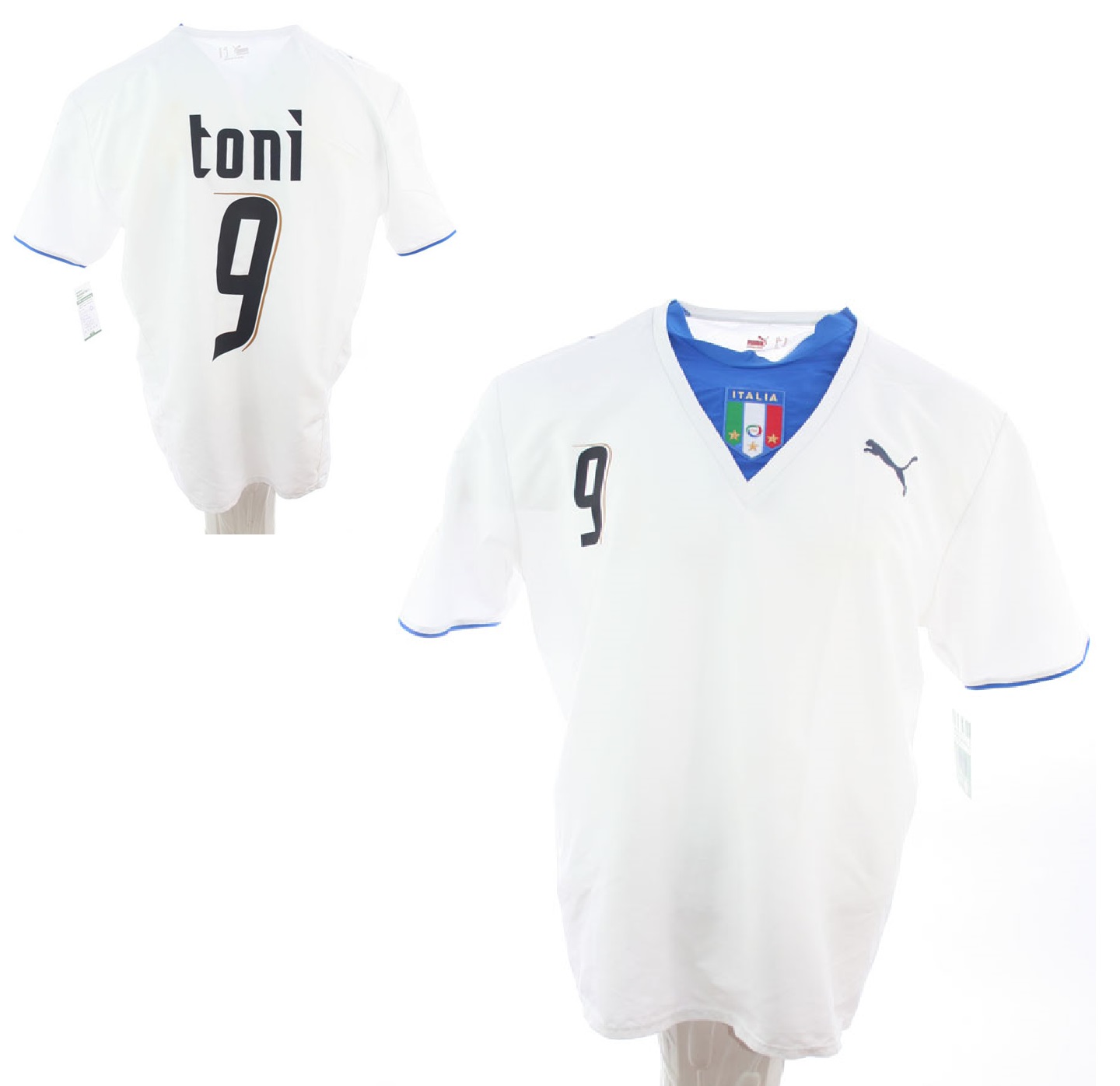 Puma Italien Trikot 9 Luca Toni WM 2006 Italien wurde in Deutschland Fußball Weltmeister hier in der Kurzarm Version in der Herrengröße XL, in der Farbe weiß also in der Auswärtstrikotversion