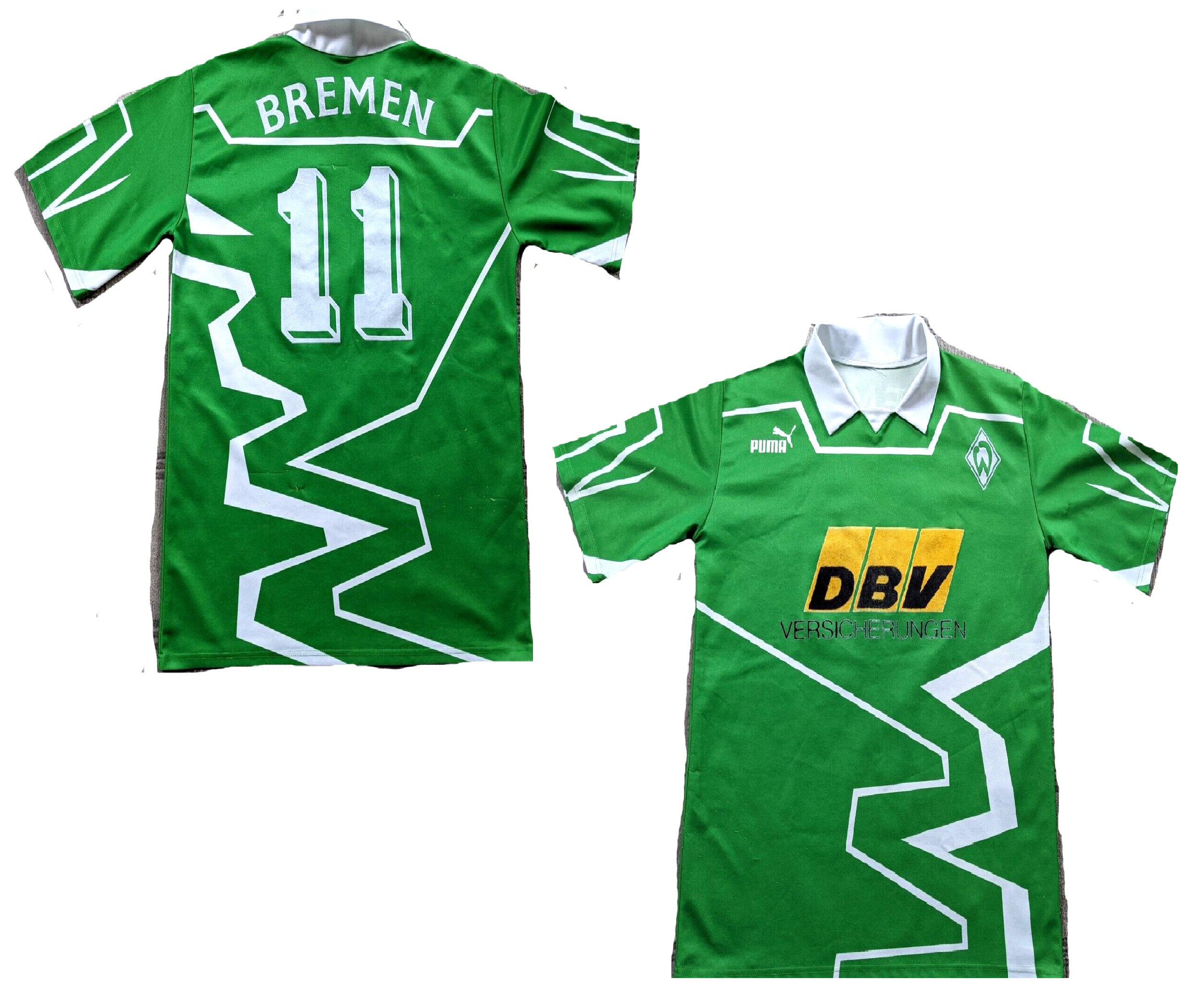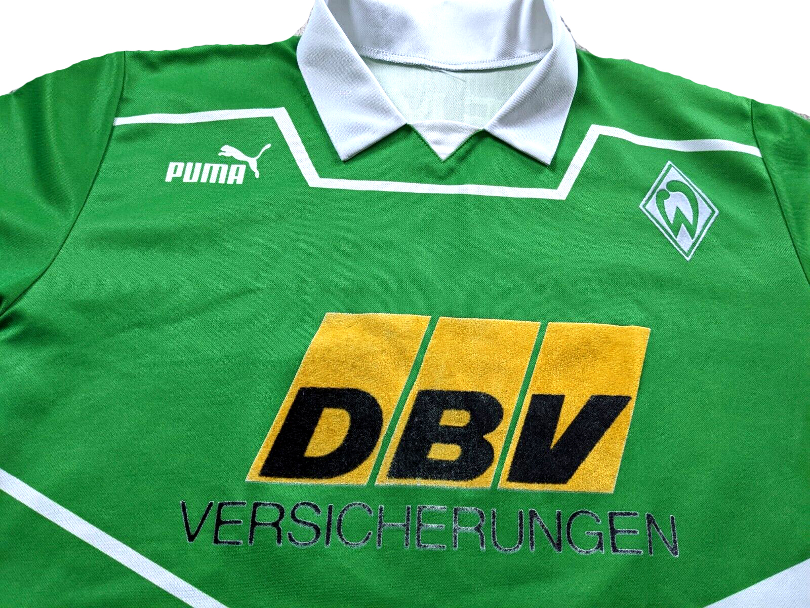 Puma SV Werder Bremen Trikot mit dem Brustsponsor DBV in der Herrengröße M und in der Farbe weiß in der seltenen ganz seltenen sogar kurzarmtrikotversion, anfang der 90er waren langarmtrikots noch die Regel. Am Ende der Saison 1993/94 war der SV Werder Bremen übrigens deutscher Meister, dass Trikot kam übrigens nur in der Hinrunde zum Einsatz!