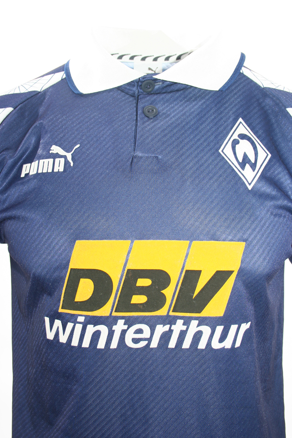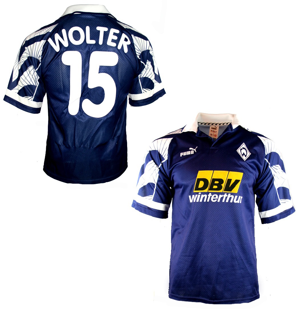 Puma SV Werder Bremen Trikot 15 Thomas Wolter aus der Saison 1996/97 mit dem Trikot Spsonor DBV s ist 1 x in der Herrengröße S verfügbar. Es handelt sich um das seltene Auswärtstrikot in der Farbe Blau.