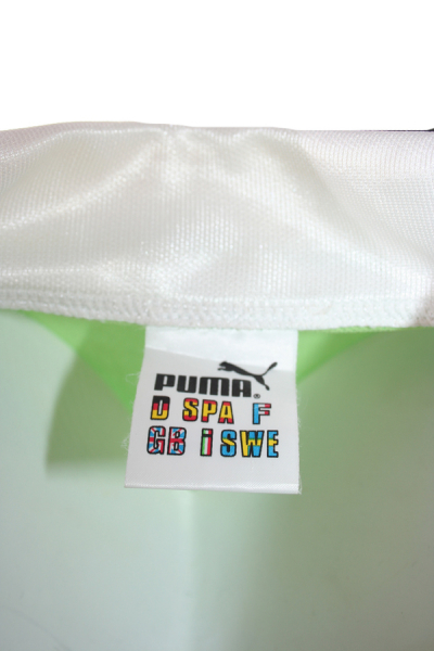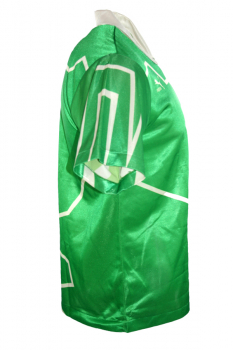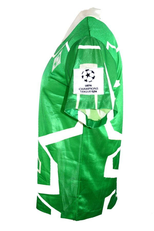 Puma SV Werder Bremen Trikot von der Nummer 8 Mirko Votava aus der UEFA Champions League von 1993/94 mit UEFA CL Champions League Patch auf der Schulter, erhalten von Mirko Votava, es ist ein echtes Spieler-Trikot in der seltenen grünen Auswärtstrikotversion in der Herrengröße L.