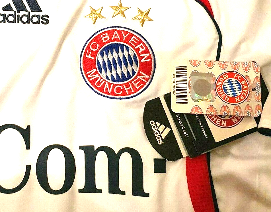 Adidas FC Bayern Munich München jersey 2006/07 T-com white home men size M = medium or XL = extra large and new with adidas tags. If you wish it with authentic name and numbering, please choose with name and numer and tell us after your purchase your nameset per E-Mail.